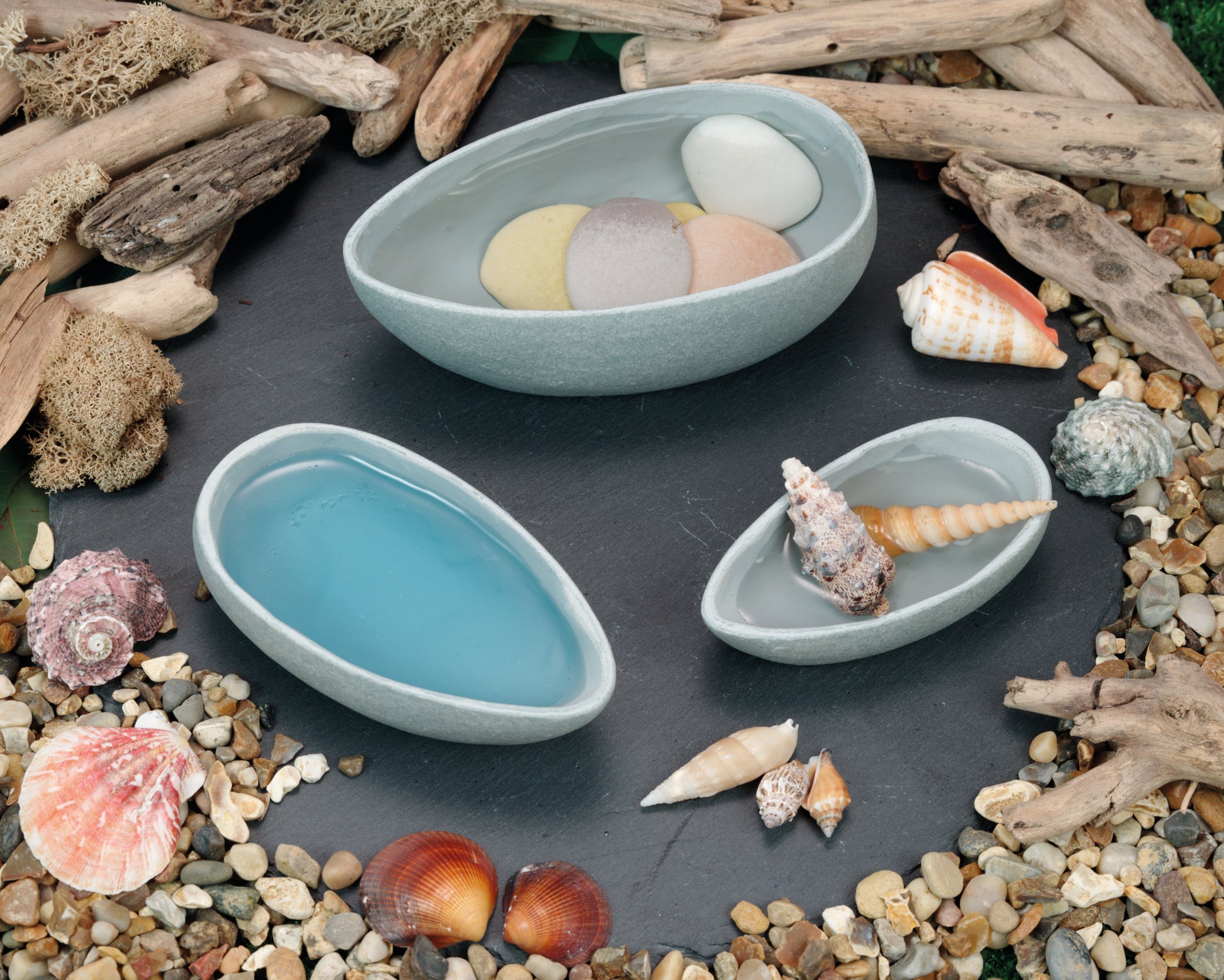These charming rustic pourers are robust enough to be used outside with a range of materials and will enhance sand, water and muddy play. Easy to hold, they can be used to scoop and pour liquids and solids. Ideal for exploring and comparing volumes, the shaped lip makes pouring intuitive and easy for young learners. Set includes three tactile pourers measuring between 105-145mm. Safe for children aged 18m+.