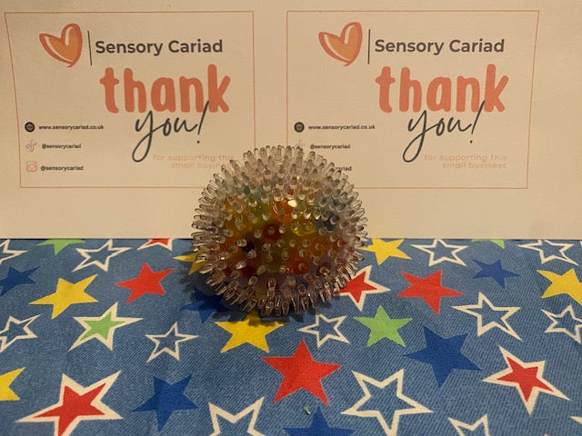 The outer ball is clear so you can see the colourful beads inside and is covered externally with additional soft spikes for that extra tactile experience.