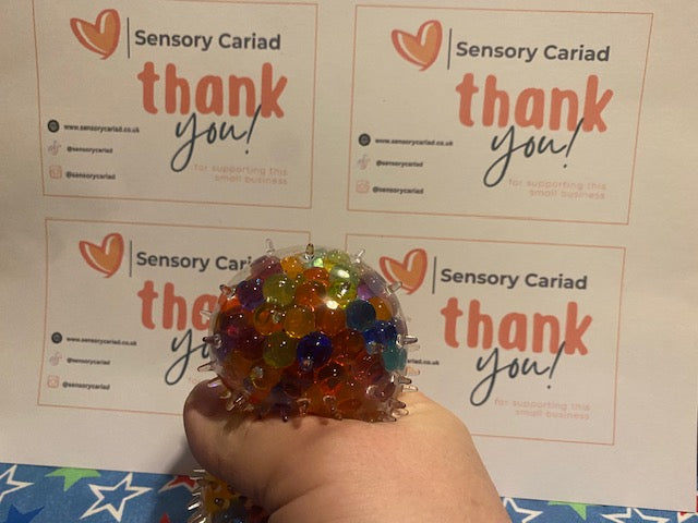A stress-relieving stress ball. Fits perfectly in the palm of your hand. This ball is filled with smaller, softer, colourful Jelly balls that move around internally when you squeeze, leaving you with that satisfying tension release.