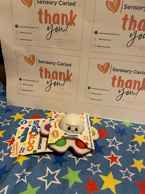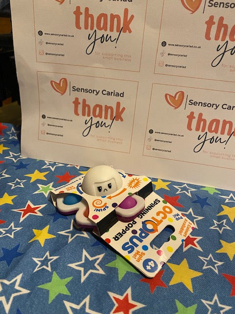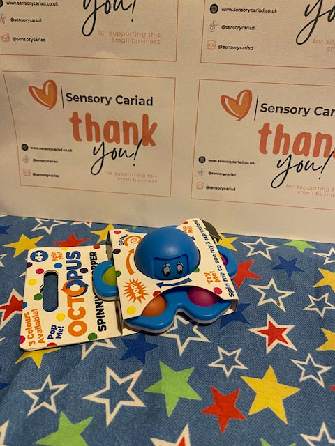 Cute 3 in 1 fidget toy. Spinner, popper and expression changer. Spin the middle to see the expression on the octopus change, pop his tentacles and spin him.