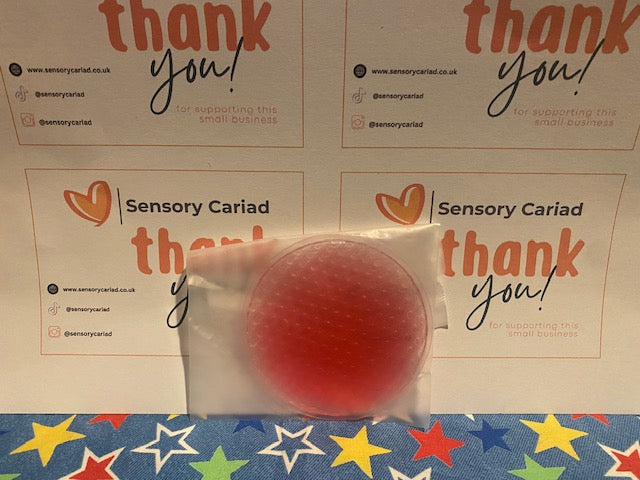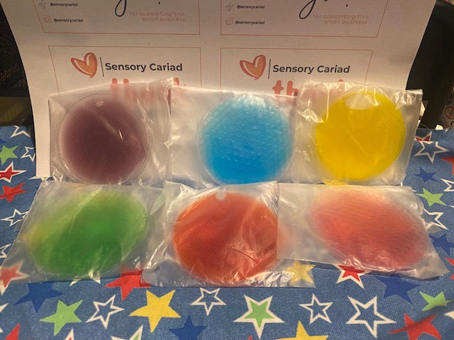 Fidget circles, each filled with a vibrant coloured liquid and a textured finish . Squish, bend, squash, push and feel. Visually entertaining, tactile and stress relieving. Helps with relaxation and concentration.